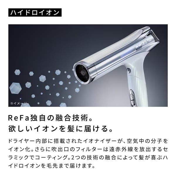 ドライヤー内部に搭載されたイオナイザーが、空気中の分子をイオン化。さらに吹出口のフィルターは遠赤外線を放出するセラミックでコーティング。
